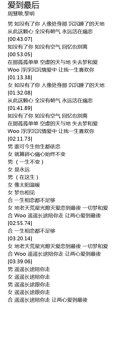 | [02:45.52] | hé Woo yáo yáo cháng tú péi nǐ zǒu ràng liǎng xīn ài dào zuì hòu |
