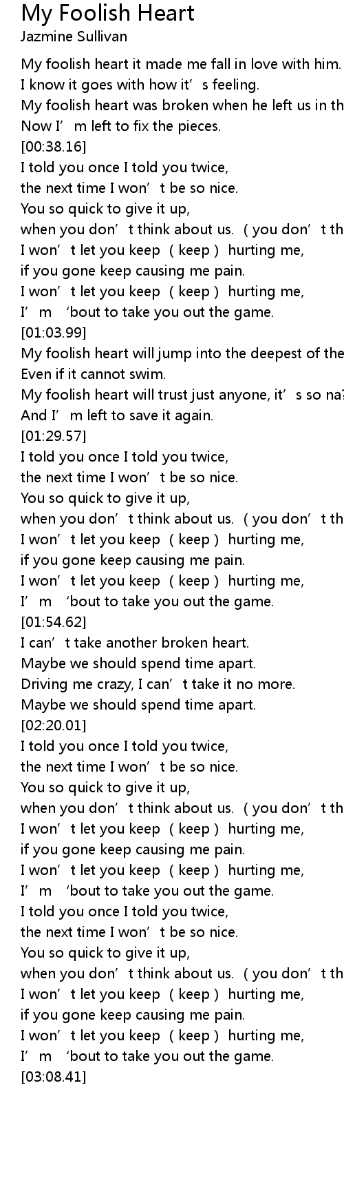 | [00:17.70] | My foolish heart it made me fall in love with him. |