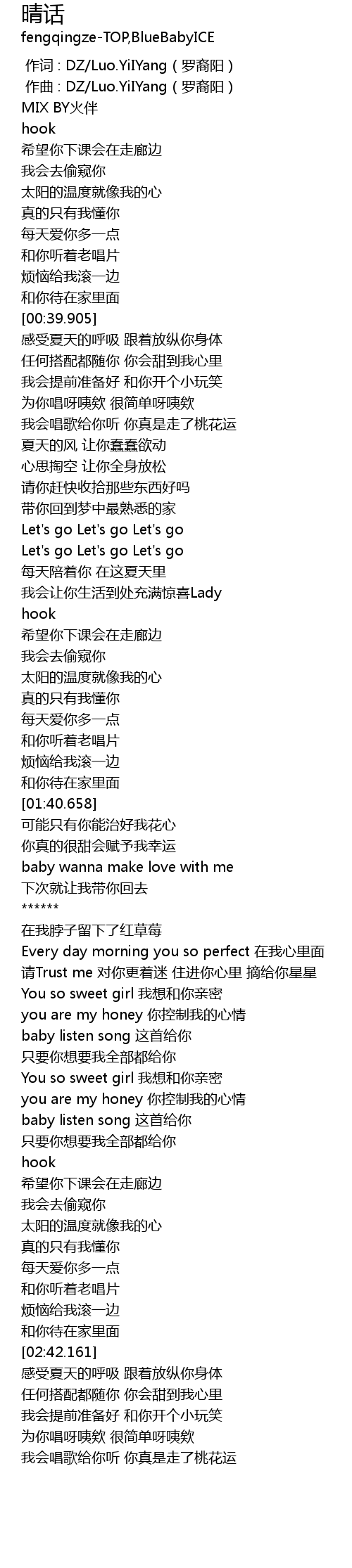 | [02:12.409] | You so sweet girl wǒ xiǎng hé nǐ qīn mì |