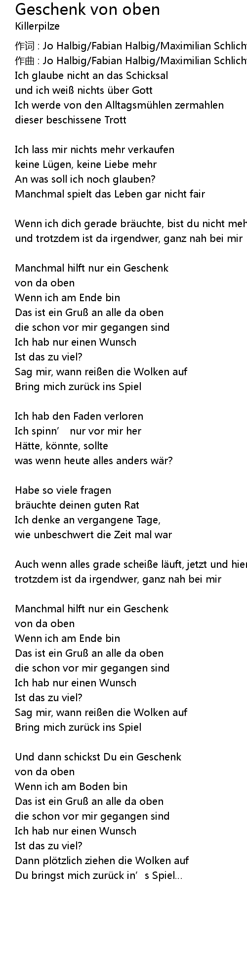 | 作词 : Jo Halbig/Fabian Halbig/Maximilian Schlichter | |