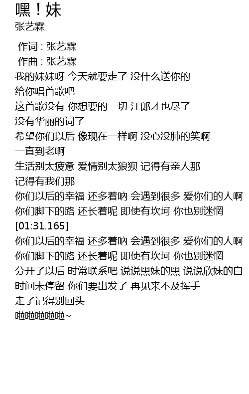 | [00:00.000] | 作词 : 张艺霖 |