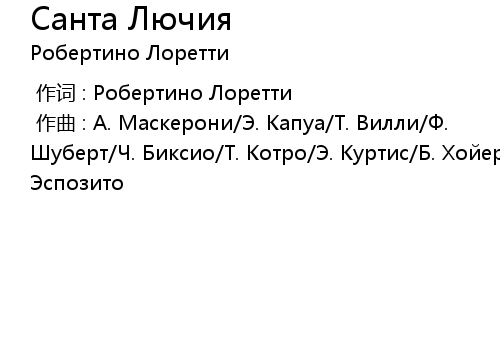 | [00:00.000] | 作曲 : А. Маскерони/Э. Капуа/Т. Вилли/Ф. Шуберт/Ч. Биксио/Т. Котро/Э. Куртис/Б. Хойер/Д. Эспозито |