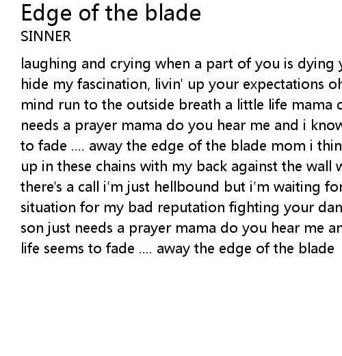 laughing and crying when a part of you is dying you won't not coming back try to hide my fascination, livin' up your expectations oh my life was tough made up my mind run to the outside breath a little life mama do you hear me your son just needs a prayer mama do you hear me and i know that you will care my life seems to fade .... away the edge of the blade mom i think i'm going insane i won't end up in these chains with my back against the wall when i touched the holy ground there's a call i'm just hellbound but i'm waiting for your fall a certain situation for my bad reputation fighting your damnation mama do you hear me your son just needs a prayer mama do you hear me and i know that you will care my life seems to fade .... away the edge of the blade