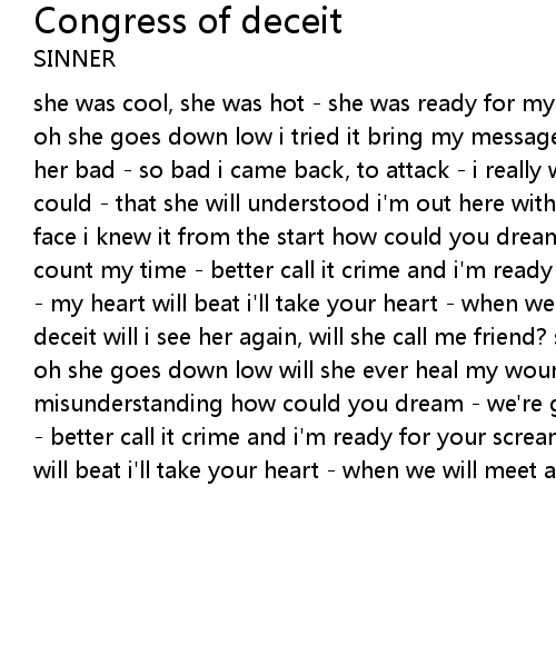 she was cool, she was hot - she was ready for my blood she goes slow, so slow - oh she goes down low i tried it bring my message back can't deny i really want her bad - so bad i came back, to attack - i really want her back but for good, i could - that she will understood i'm out here with my restless heart face to face i knew it from the start how could you dream - we're go to extremes i will count my time - better call it crime and i'm ready for your scream i will go on - my heart will beat i'll take your heart - when we will meet at the congress of deceit will i see her again, will she call me friend? she goes slow, so slow - oh she goes down low will she ever heal my wounds or is it up a big misunderstanding how could you dream - we're go to extremes i will count my time - better call it crime and i'm ready for your scream i will go on - my heart will beat i'll take your heart - when we will meet at the congress of deceit |