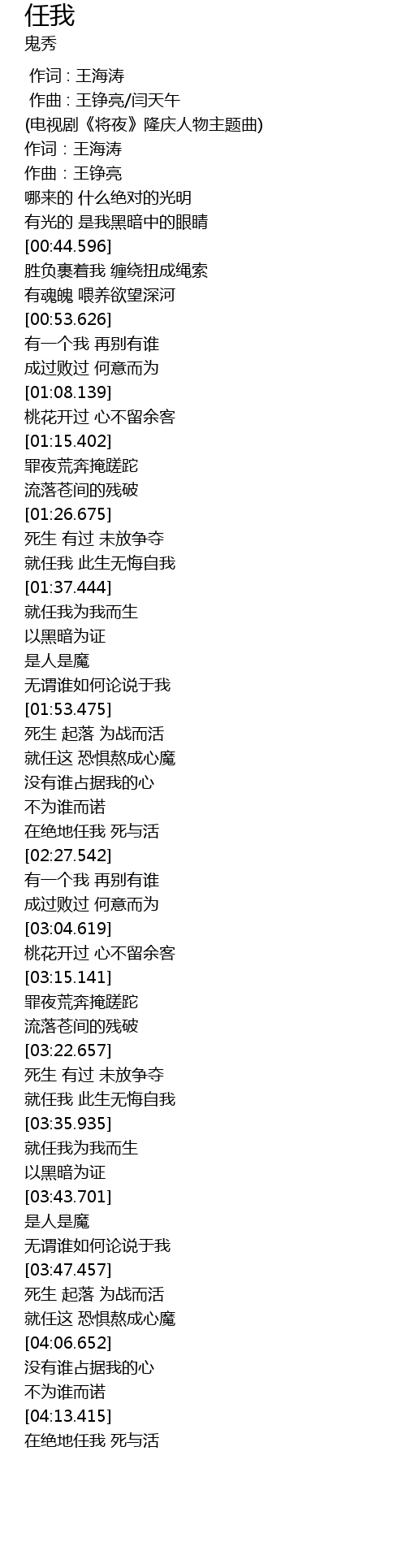 | [00:01.000] | zuo qu : wang zheng liang yan tian wu |