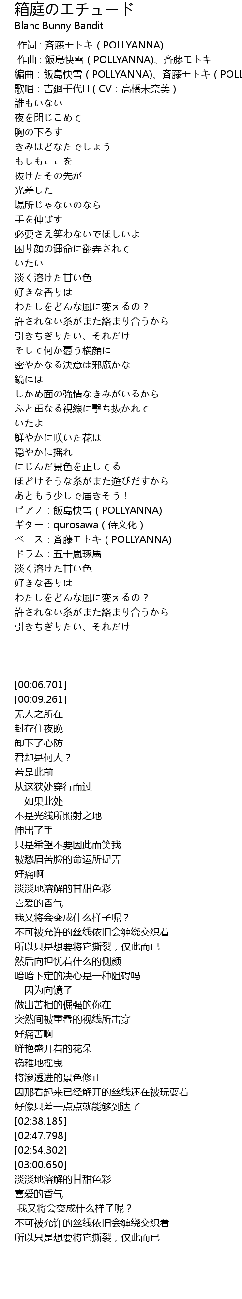 | [00:06.701] | 編曲:飯島快雪(POLLYANNA)、斉藤モトキ(POLLYANNA) |
