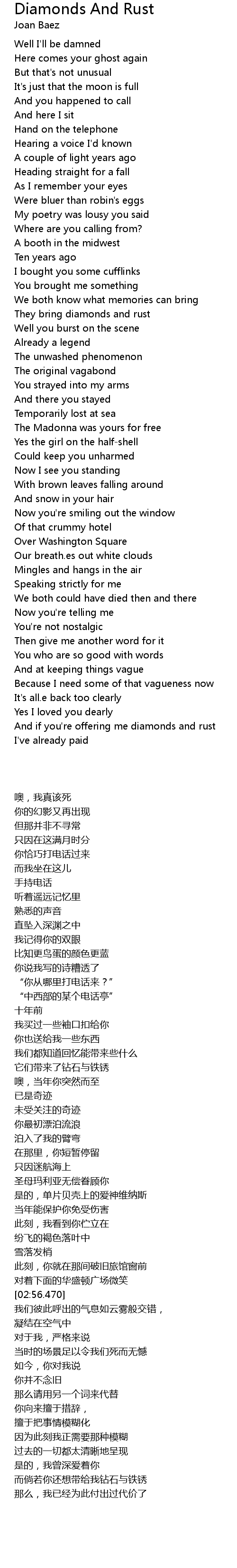 | [01:40.959] | They bring diamonds and rust |