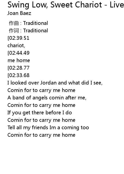 | [02:58.35][02:39.51][02:19.59][01:43.38][01:24.19][00:00.52] | Swing low sweet chariot, |