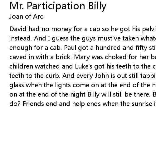 David had no money for a cab so he got his pelvis smashed with a baseball bat instead. And I guess the guys must've taken whatever money he had that wasn't enough for a cab. Paul got a hundred and fifty stiches when he got his face caved in with a brick. Mary was choked for her bag on her stoop while her children watched and Luke's got his teeth to the curb already. Luke's got his teeth to the curb. And every John is out still tapping morse code on a pint glass when the lights come on at the end of the night. And when the lights come on at the end of the night Billy will still be there. Billy, Billy what can you do? Friends end and help ends when the sunrise is your shore. |