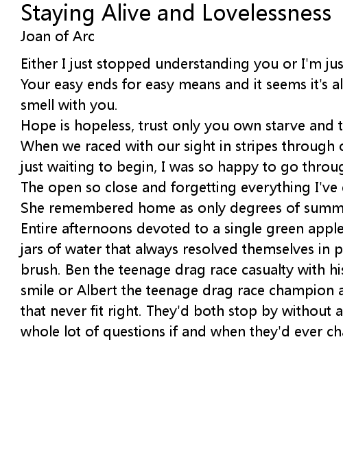 Entire afternoons devoted to a single green apple, the swirling clouds in glass jars of water that always resolved themselves in purples with each dip of her brush. Ben the teenage drag race casualty with his slow suited wasy and sudden smile or Albert the teenage drag race champion always in a different nice shirt that never fit right. They'd both stop by without anything much to say but a whole lot of questions if and when they'd ever chance upon each other.