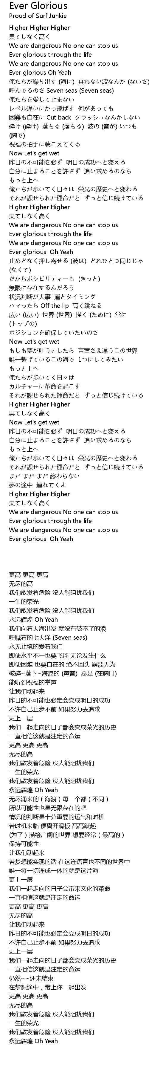 | [00:23.1] | 俺たちが繰り出す (海に) 乗れない波なんか (ないさ) |