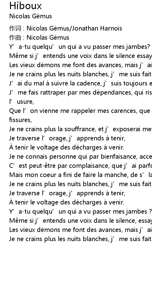 | 作词 : Nicolas Gémus/Jonathan Harnois | |
