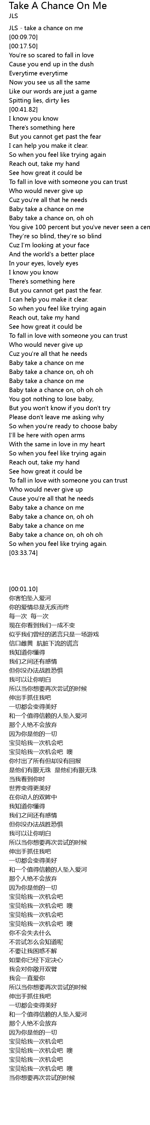 | [03:24.31] | Baby take a chance on, oh oh oh |