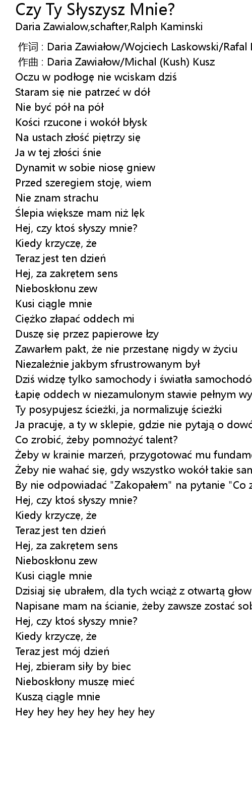 | [00:00.000] | zuò cí : Daria Zawia ow Wojciech Laskowski Rafal Kaminski |