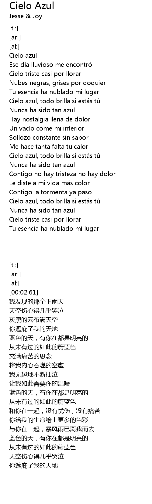 | [02:15.33] | Cielo azul, todo brilla si está s tú |