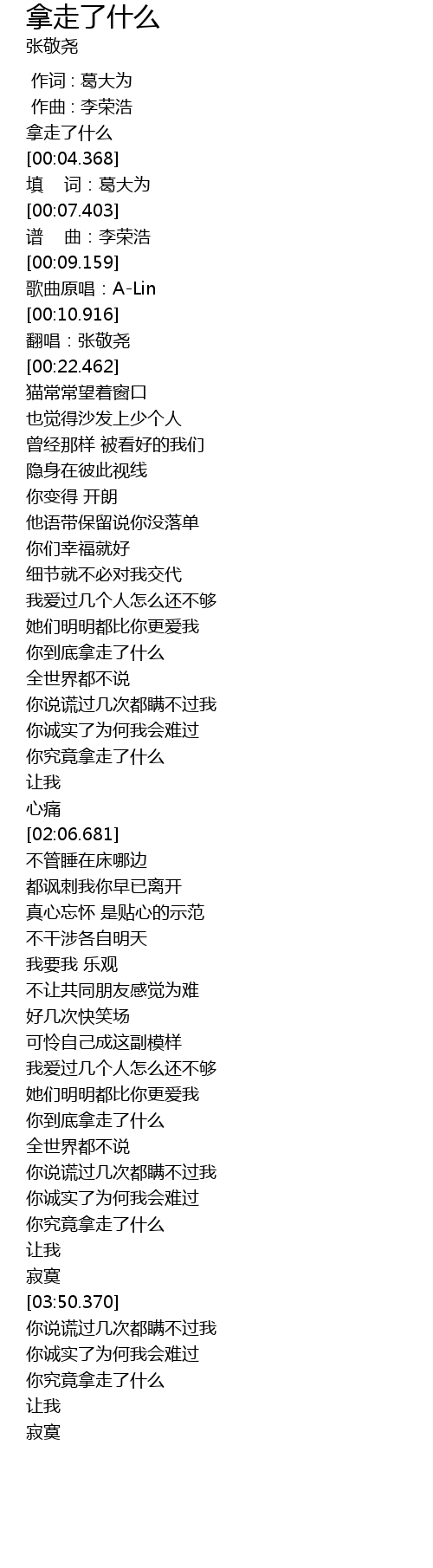 | [03:36.814] | nǐ jiū jìng ná zǒu le shén me |