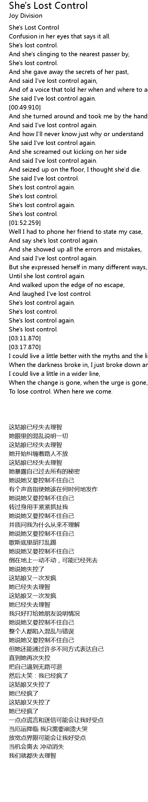 | [00:44.910] | She said I' ve lost control again. |