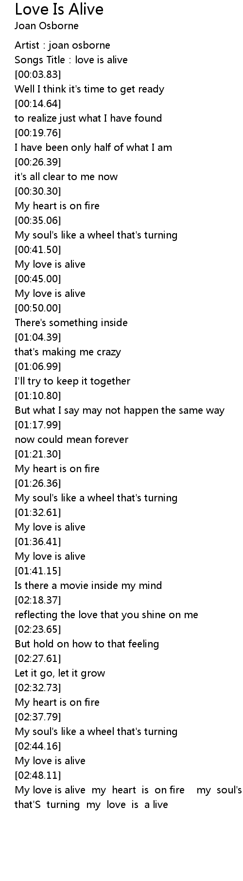| [02:52.49] | My love is alive my heart is on fire my soul's like a wheel that'S turning my love is a live |