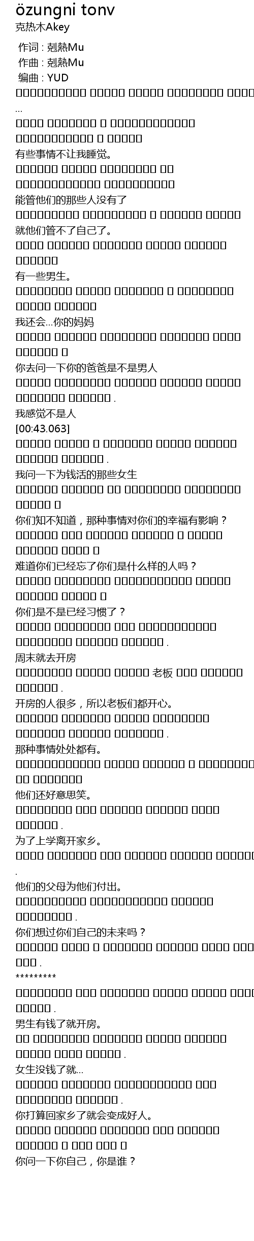 | [00:59.563] | مەينەت نېمىلەر بولۇڭ بولۇڭلار ئۆتكىلى بولماس كوچىلار . |