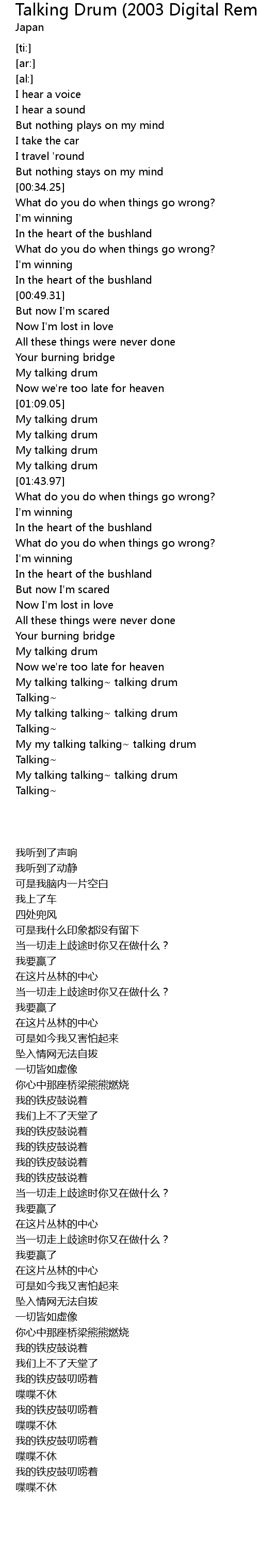 | [03:11.13] | My talking talking~ talking drum |
