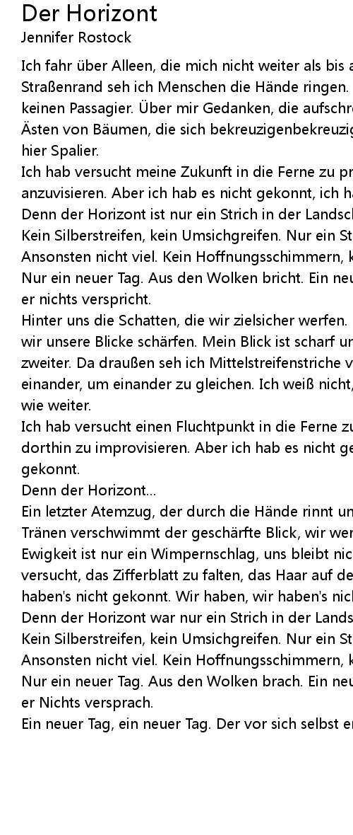 | Denn der Horizont war nur ein Strich in der Landschaft. Kein Ende, kein Ziel. Kein Silberstreifen, kein Umsichgreifen. Nur ein Strich in der Landschaft. Ansonsten nicht viel. Kein Hoffnungsschimmern, kein Hoffnungsflimmern. | |