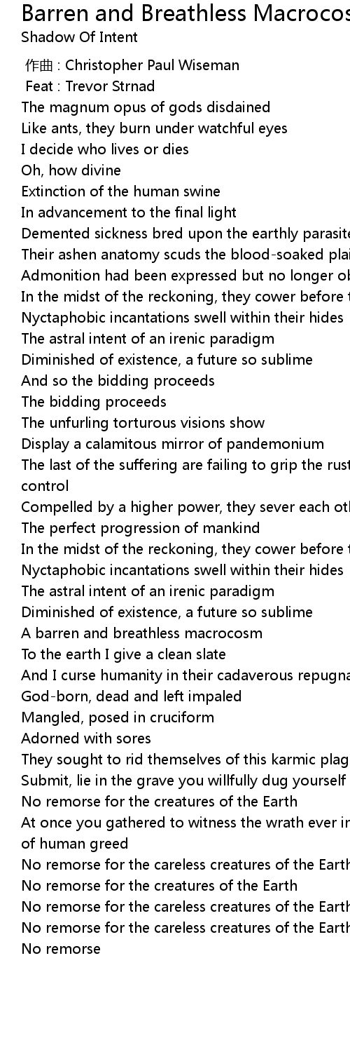 | [04:03.94] | No remorse for the careless creatures of the Earth |