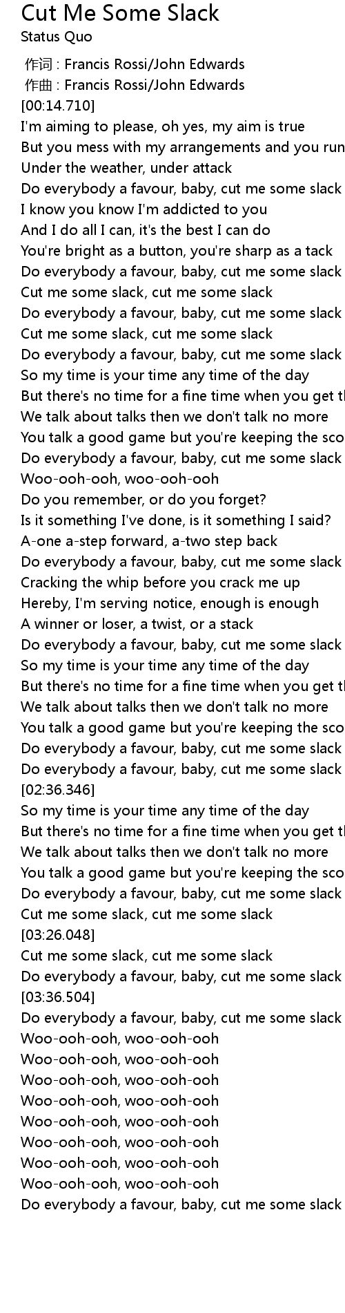 | [02:32.311] | Do everybody a favour, baby, cut me some slack |
