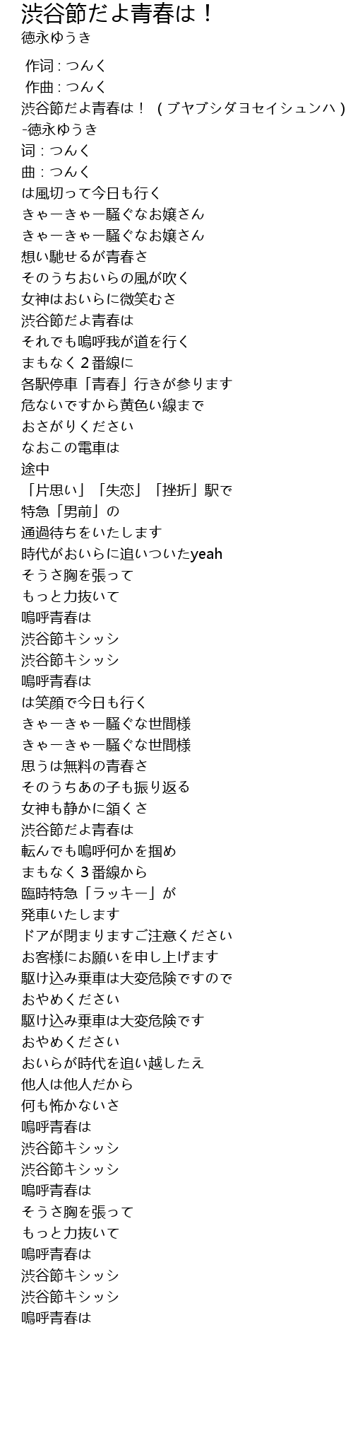 | [00:00.00] | 渋谷節だよ青春は! (ブヤブシダヨセイシュンハ) -徳永ゆうき |