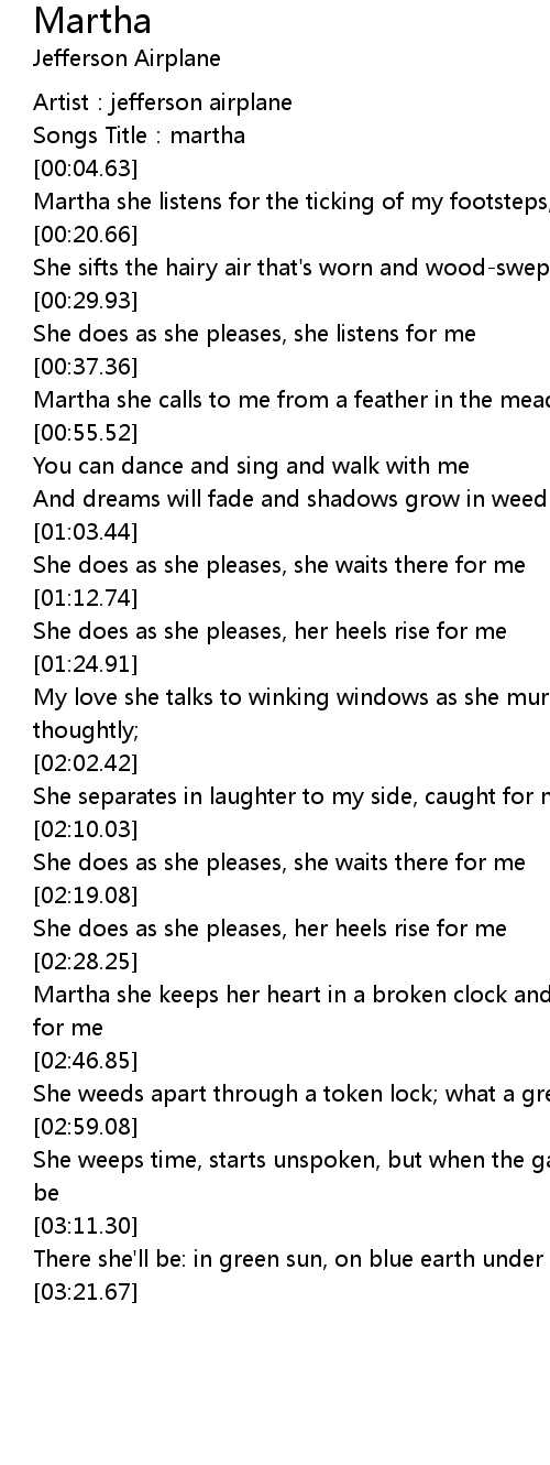 | [00:47.35] | Martha she calls to me from a feather in the meadow, "fly to me" |