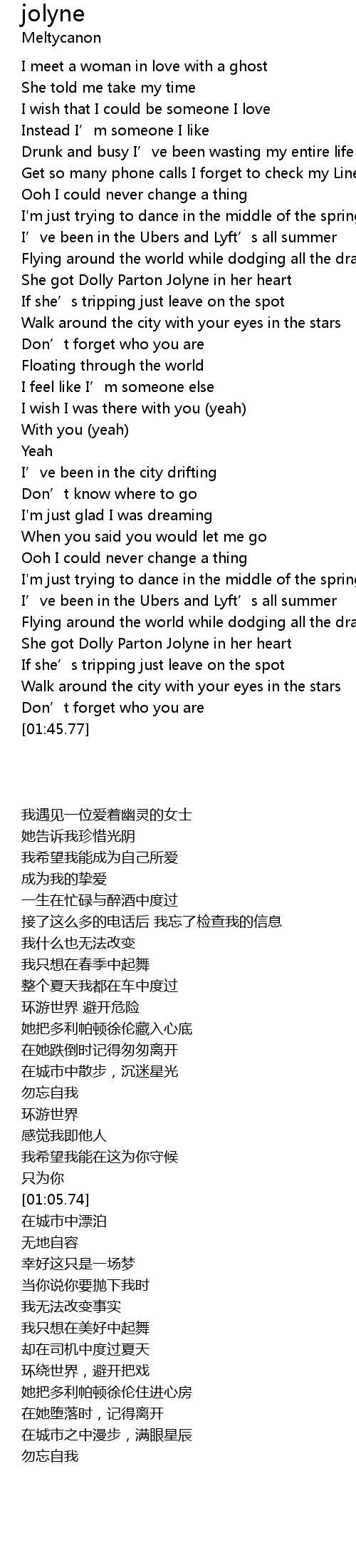 | [01:32.61] | She got Dolly Parton Jolyne in her heart |