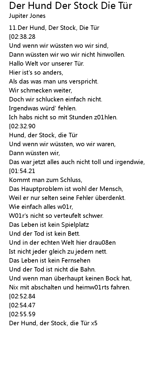 | [02:35.59][02:32.90][02:27.59][02:21.90][02:16.59][01:31.83][01:29.08][01:23.77][01:18.21][01:12.84] | Der Hund, der Stock, die Tü r |