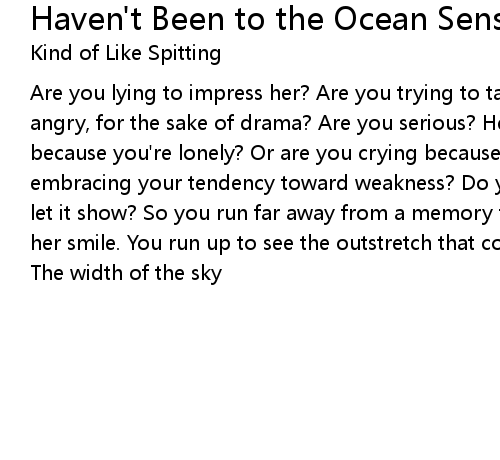 | Are you lying to impress her? Are you trying to take off her clothes? Are you angry, for the sake of drama? Are you serious? Heaven knows. Are you crying because you're lonely? Or are you crying because you're alone? Are you begging, embracing your tendency toward weakness? Do you think you'll get her back if you let it show? So you run far away from a memory that contains her smile, contains her smile. You run up to see the outstretch that contains the width of the sky. The width of the sky |