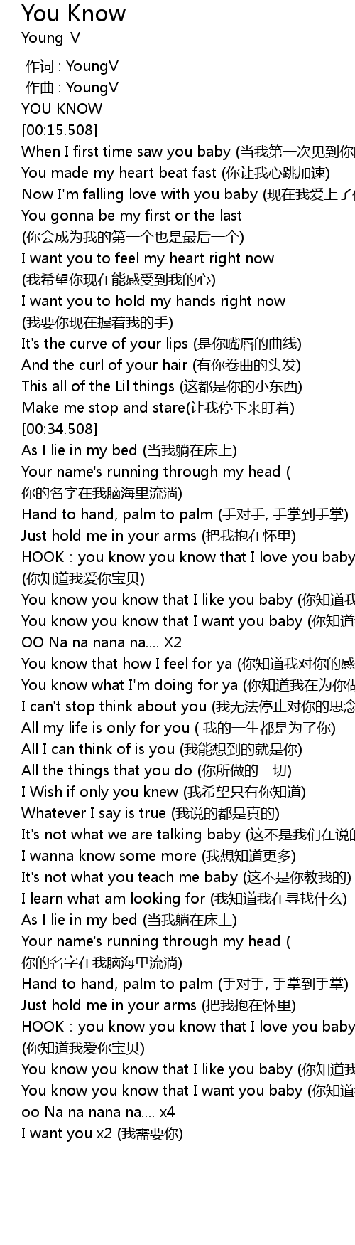 | [01:41.190] | HOOK: you know you know that I love you baby nǐ zhī dào wǒ ài nǐ bǎo bèi |
