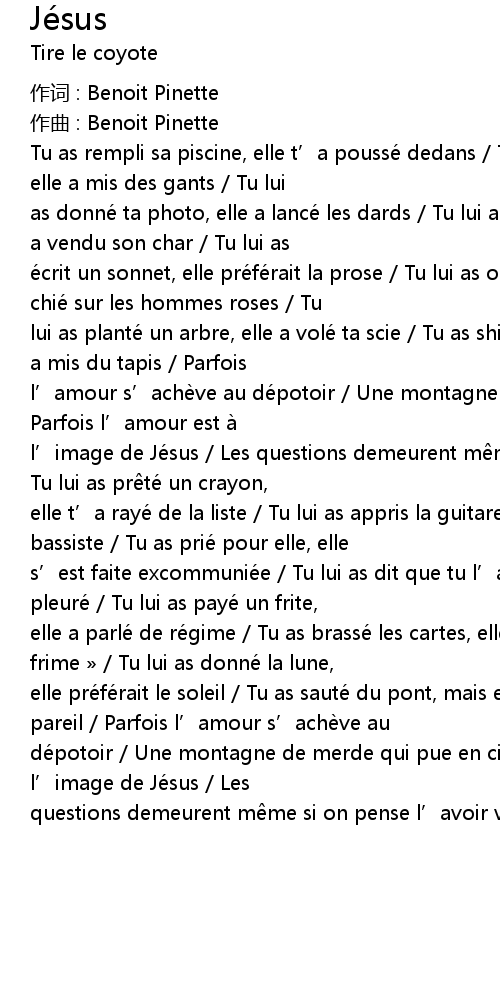 | Tu as rempli sa piscine, elle t’a poussé dedans / Tu as caressé sa main, elle a mis des gants / Tu lui | |