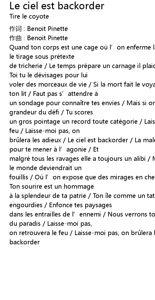 | on retrouvera le feu Laissemoi pas, on br lera les adieux Le ciel est backorder |