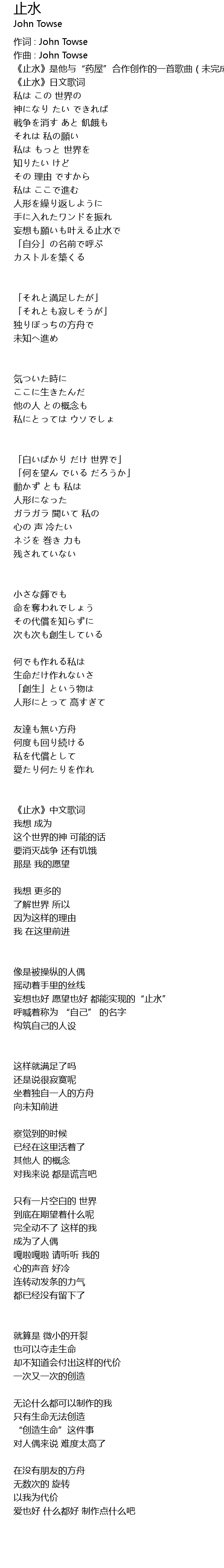 | 《止水》是他与“药屋”合作创作的一首歌曲(未完成),词曲也均由本人创作。前面隐去了两个字,全称意为“心如止水”。他在不断的成长和成熟中反问自己的内心,表达着自己对生活和世界的反思,并在歌曲中下定决心要努力多为这个世界做点什么,留下一些痕迹。 | |