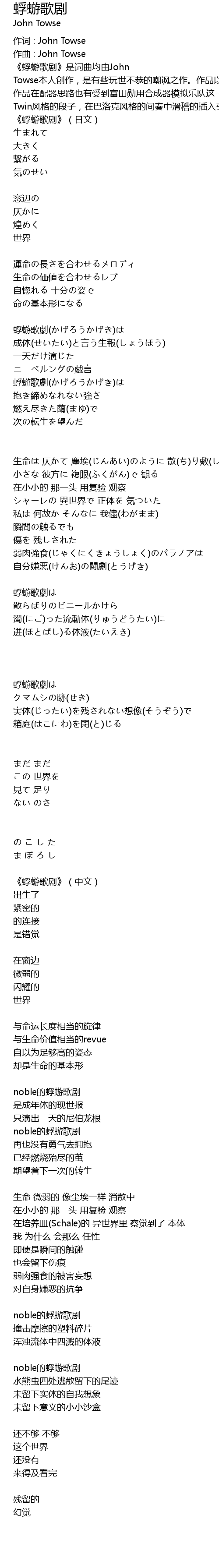 | 《蜉蝣歌剧》是词曲均由John Towse本人创作,是有些玩世不恭的嘲讽之作。作品以一种滑稽的方式引用了许多人认为“高大上”的内容用于暗讽:“自以为高贵出众的蝼蚁。” | |