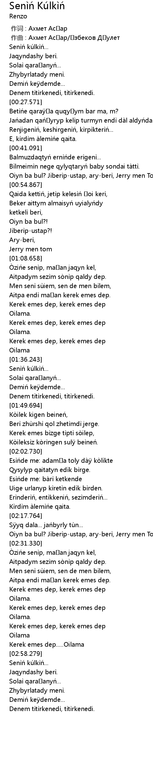 | [00:01.000] | 作曲 : Аxмет Асқар/Өзбеков Дәулет |