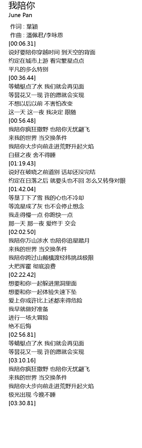 | [03:10.85] | 我陪你疯狂撒野 也陪你无忧翩飞 |