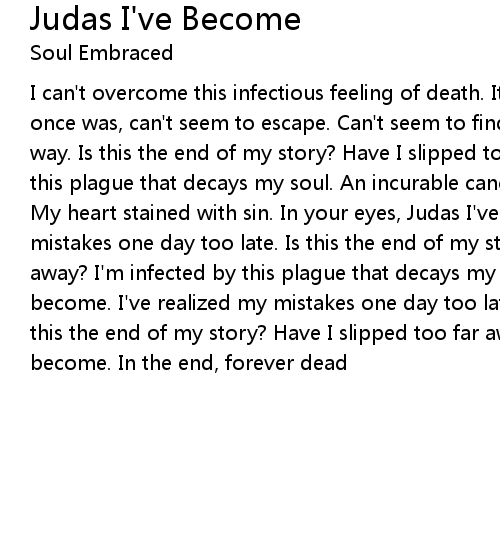 I can't overcome this infectious feeling of death. It's drained me of what I once was, can't seem to escape. Can't seem to find my way, can't seem to find my way. Is this the end of my story? Have I slipped too far away? I'm infected by this plague that decays my soul. An incurable cancer. Suffering is all I know. My heart stained with sin. In your eyes, Judas I've become. I've realized my mistakes one day too late. Is this the end of my story? Have I slipped too far away? I'm infected by this plague that decays my soul. In your eyes, Judas I've become. I've realized my mistakes one day too late. In the end, forever dead. Is this the end of my story? Have I slipped too far away? In your eyes, Judas I've become. In the end, forever dead |
