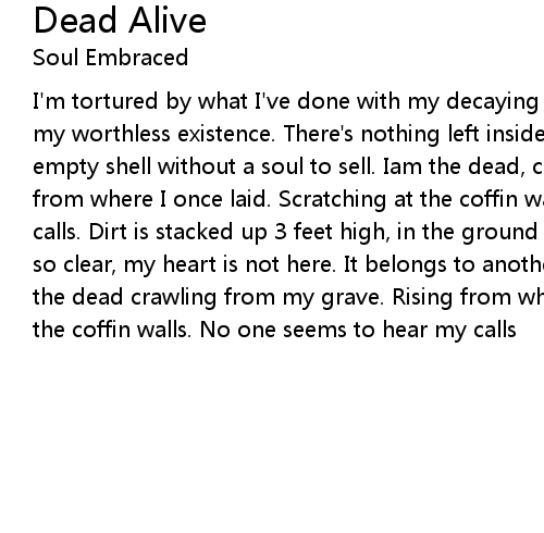 I'm tortured by what I've done with my decaying life. I've failed to cope with my worthless existence. There's nothing left inside, everyday I am dying. An empty shell without a soul to sell. Iam the dead, crawling from my grave. Rising from where I once laid. Scratching at the coffin walls. No one seems to hear my calls. Dirt is stacked up 3 feet high, in the ground is where I lie. The truth so clear, my heart is not here. It belongs to another that eats the fear. I am the dead crawling from my grave. Rising from where I once laid. Scratching at the coffin walls. No one seems to hear my calls |
