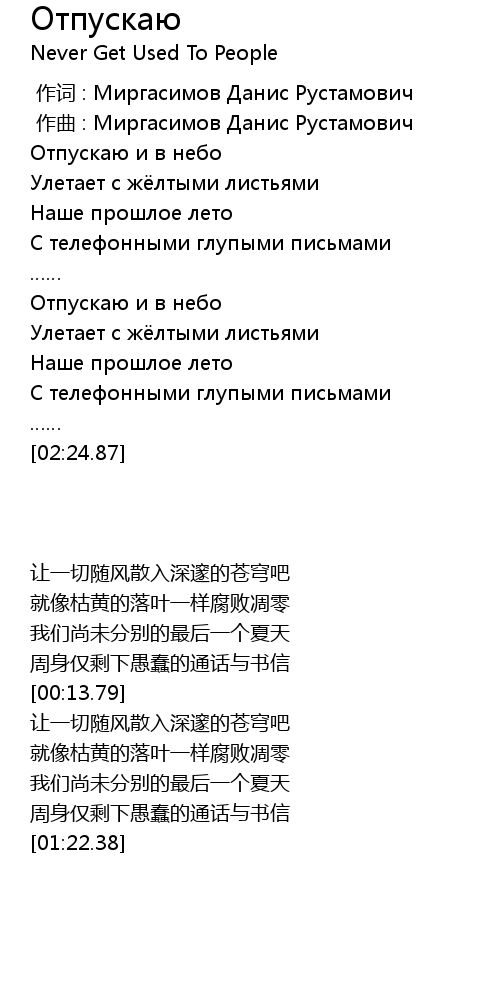 | [00:00.000] | 作词 : Миргасимов Данис Рустамович |