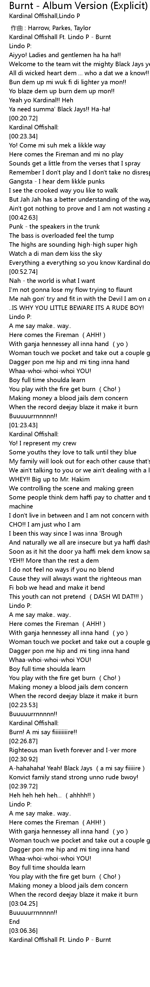 | [03:32.12] | Kardinal Offishall Ft. Lindo P Burnt |