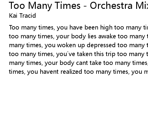 | Too many times, you have been high too many times, you ran away, in need to cry too many times, your body lies awake too many times, these pills you take... too many times, you woken up depressed too many times, you put your life to the test too many times, you ve taken this trip too many times, you have slipped too many times, your body cant take too many times, you made a mistake too many times, you havent realized too many times, you mind became paralyzed |
