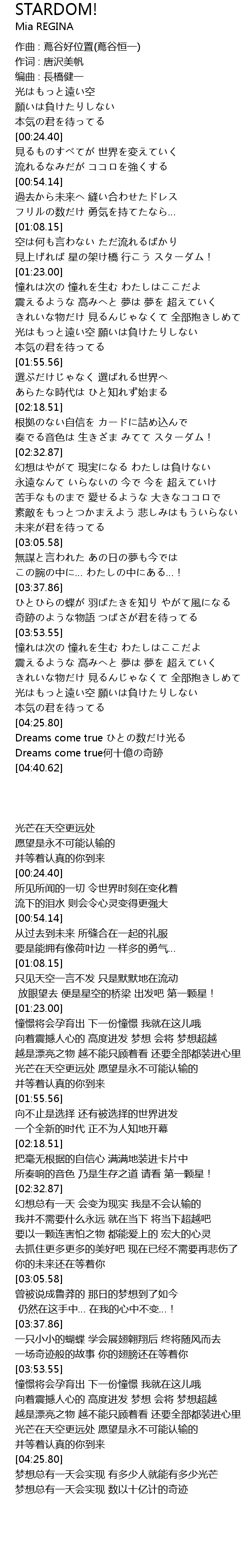 | [01:16.02] | 見上げれば 星の架け橋 行こう スターダム! |