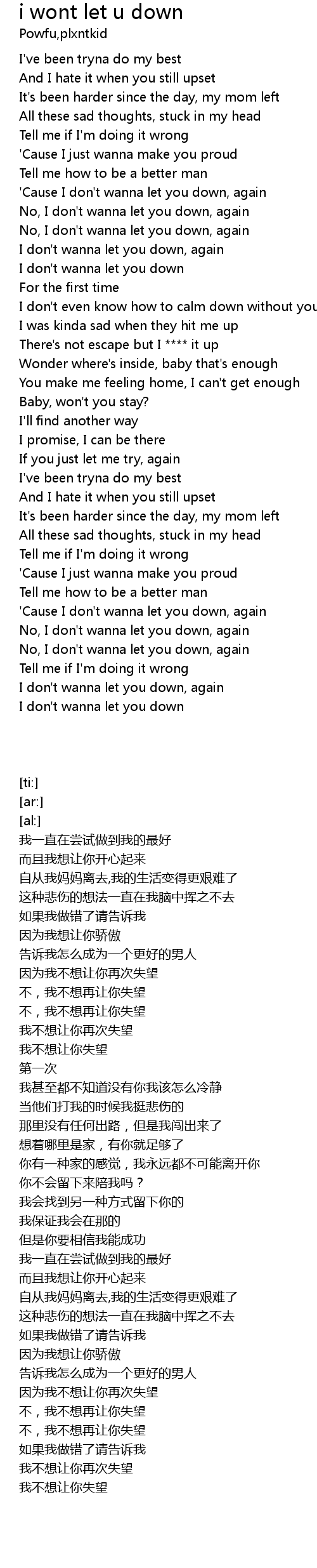 | [00:58.13] | No, I don't wanna let you down, again |