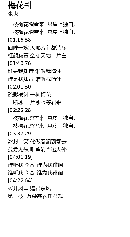 | [01:00.75] | 一枝梅花踏雪来 悬崖上独自开 |
