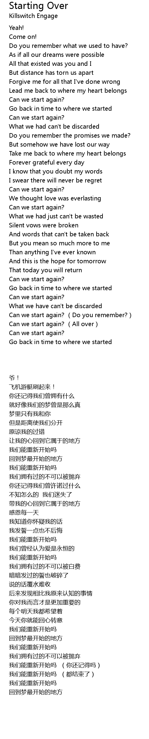 | [03:30.93] | Can we start again? (All over) |