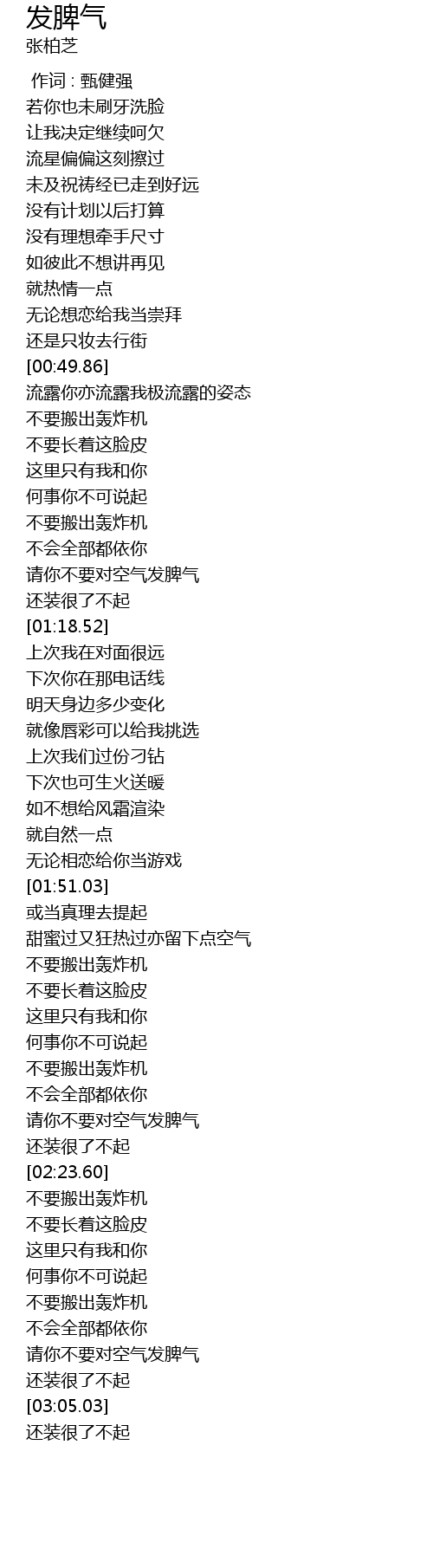 | [02:57.92] | qǐng nǐ bú yào duì kōng qì fā pí qì |