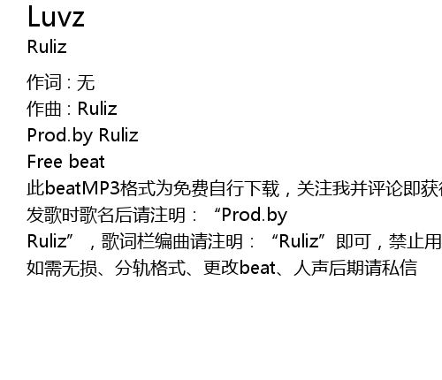 | 发歌时歌名后请注明:“Prod.by Ruliz”,歌词栏编曲请注明:“Ruliz”即可,禁止用于商业性质,尊重知识产权,侵权必究,谢谢。 | |
